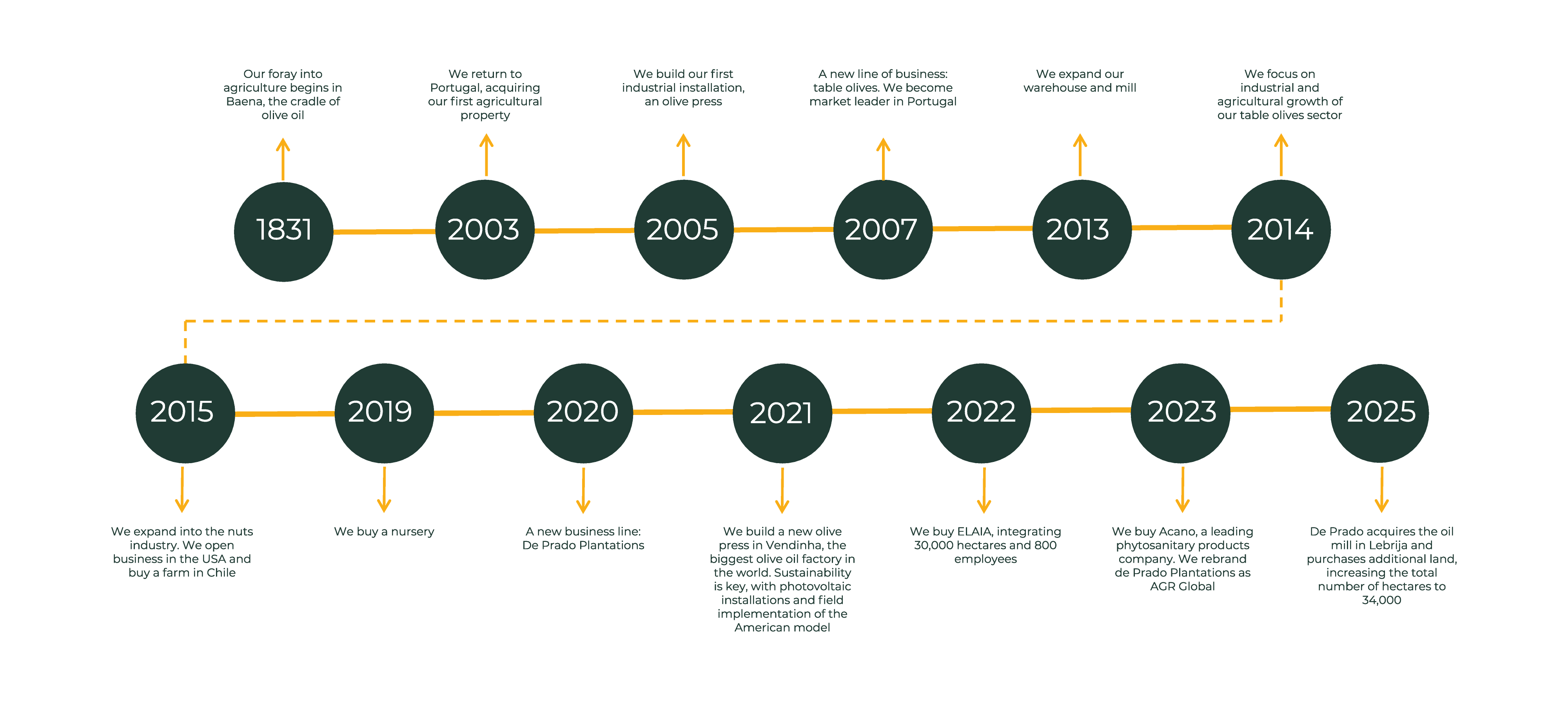 2025 De Prado acquires the oil mill in Lebrija and purchases additional land, increasing the total number of hectares to 34,000.